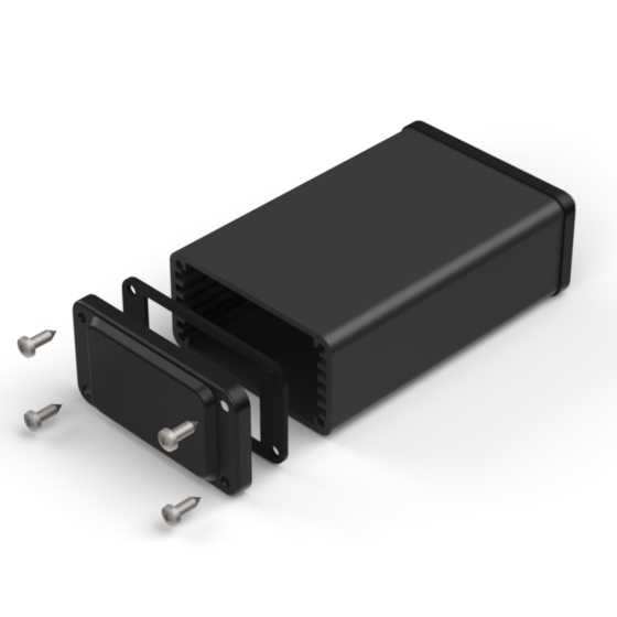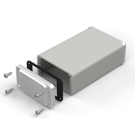 Compact extruded aluminium case with powder coating. Two aluminium front cover panels with two rubber sealing kits to protect against water and from dust. Internal slots for PCB’s. Closing by eight screws.