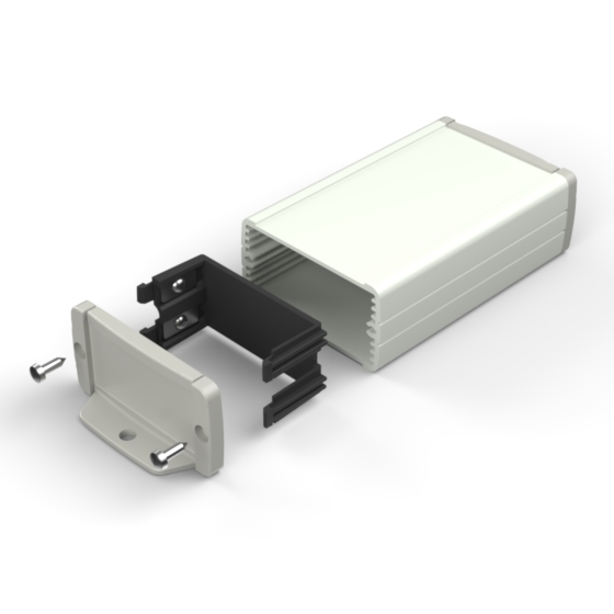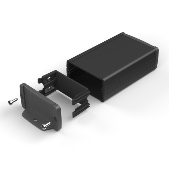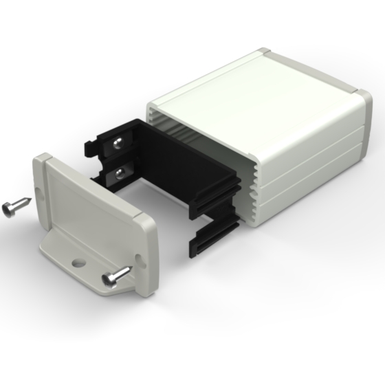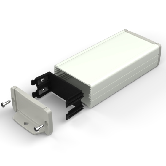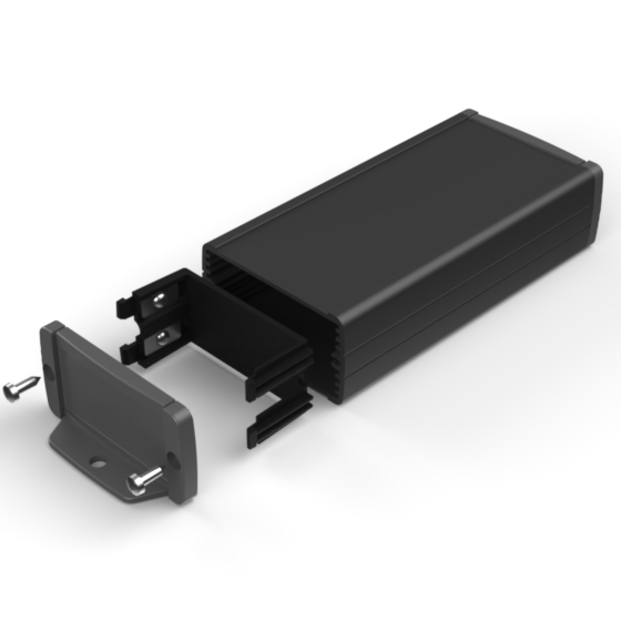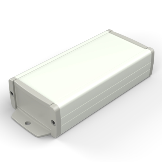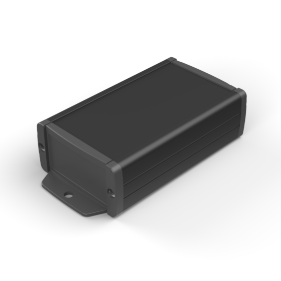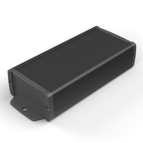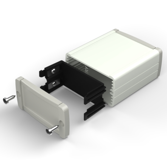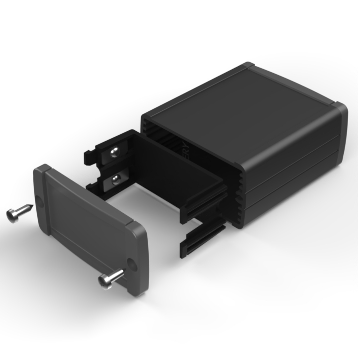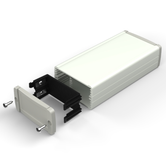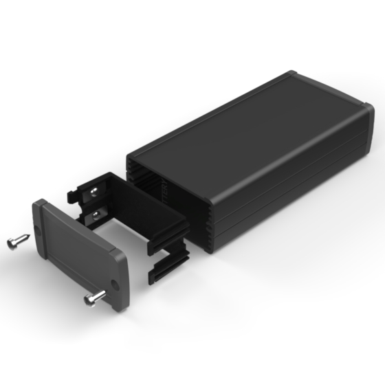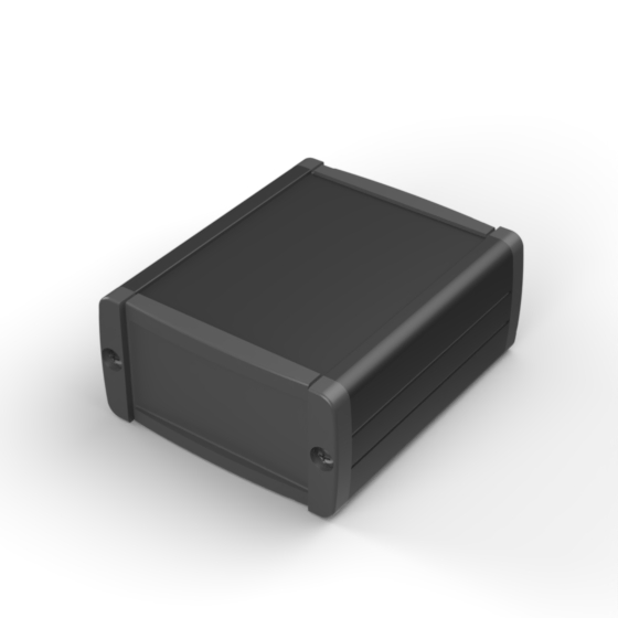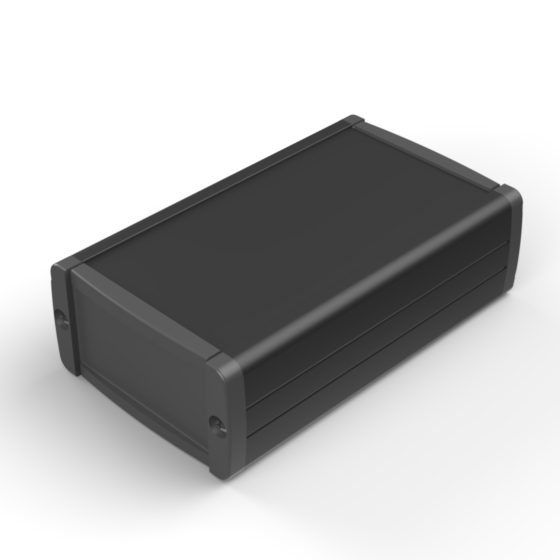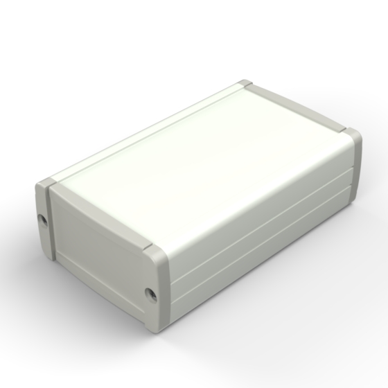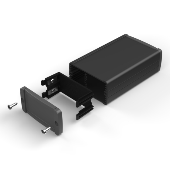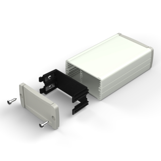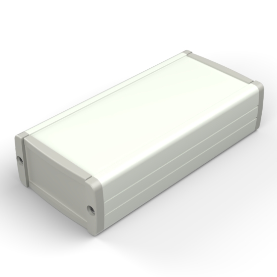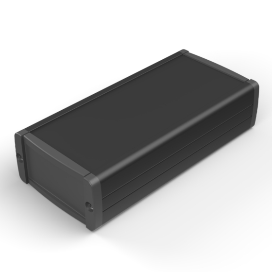 Extruded aluminium cases with high quality painted finishing. Two ABS front panels, internal slots for PCB’s and a recessed area for a keypad membrane. The model with “-B” has a battery compartment for two 1,5V mignon-cells (AA) or one 9V battery (PP3). Twelve standard models are available with different sizes. Closing by four screws.