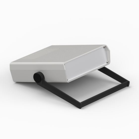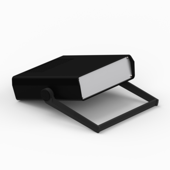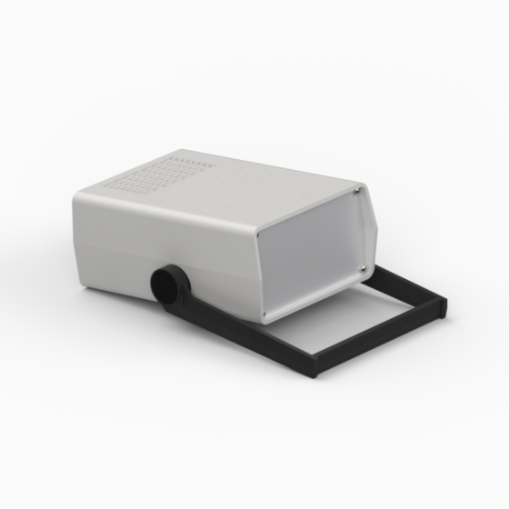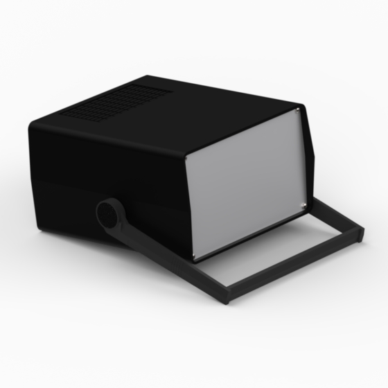 ABS enclosures with a handle that can be locked in any of eight positions and used as a stand. Vented cover and base for aeration. Front and rear 1 mm aluminium panels. Each half-shell has integral PCB guides and mounting studs. Matt surface finish. Closing by eight screws.