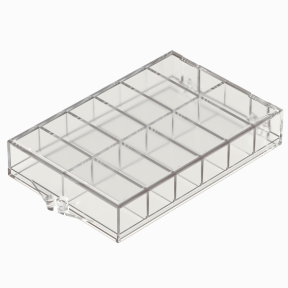 Series of small storage boxes with hinged transparent polystyrene lid. Glossy surfaces finish.