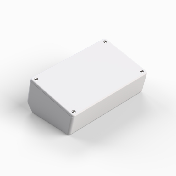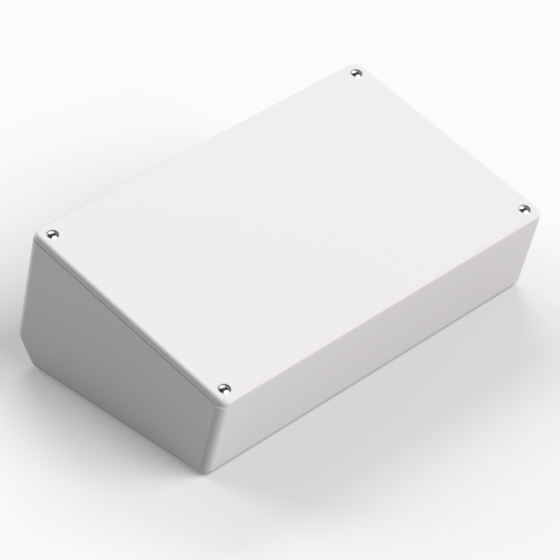 ABS enclosure with a 15° inclined panel. The base walls have integral PCB guides and mounting studs. Rounded corners. Glossy surfaces finish. Closing by four screws.