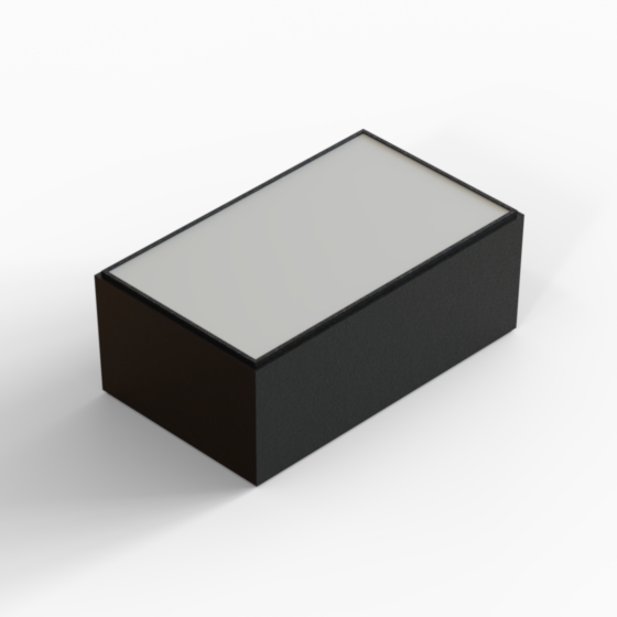 ABS enclosures with a plastic cover and an aluminium panel. Glossy surface finish. The cover has a recessed area to hold an 0.5 mm anodized aluminium panel. The base walls have integral PCB guides. Closing by four screws.