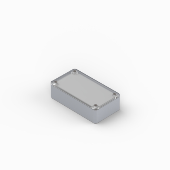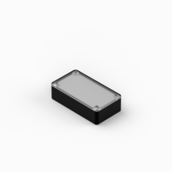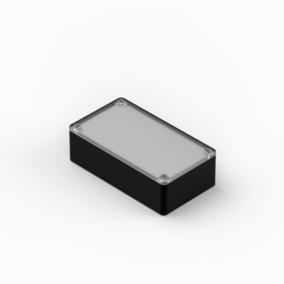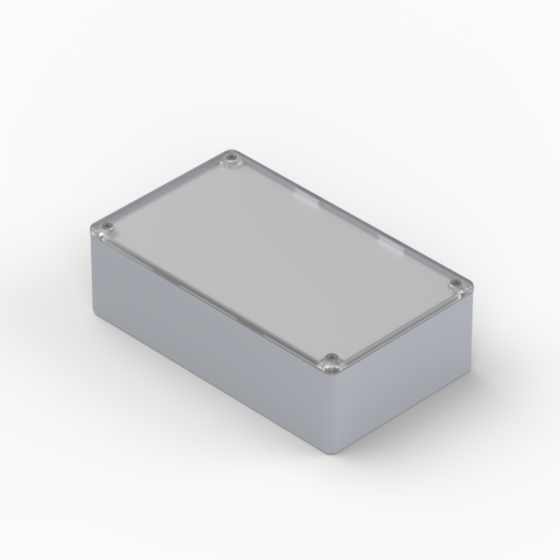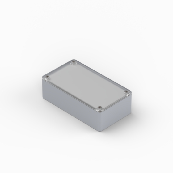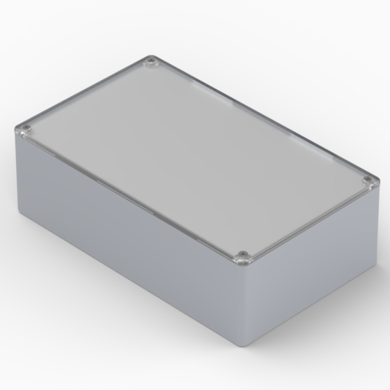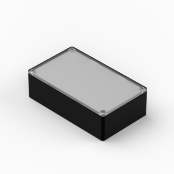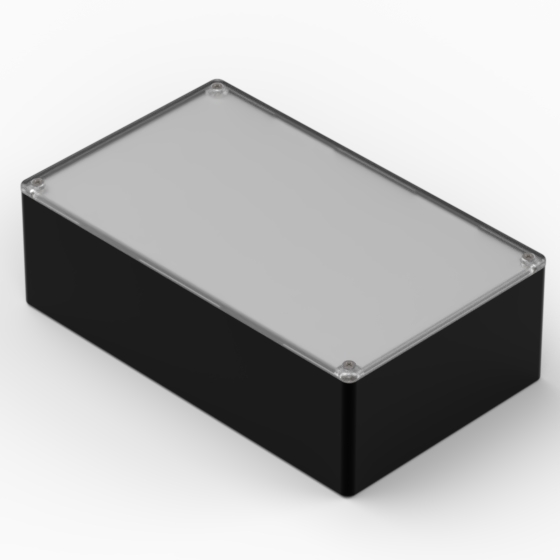 ABS enclosure with an 0.5 mm anodised aluminium panel and a transparent polycarbonate cover. The base walls have integral PCB guides in a high density configuration. Glossy surfaces finish. Closing by four screws.